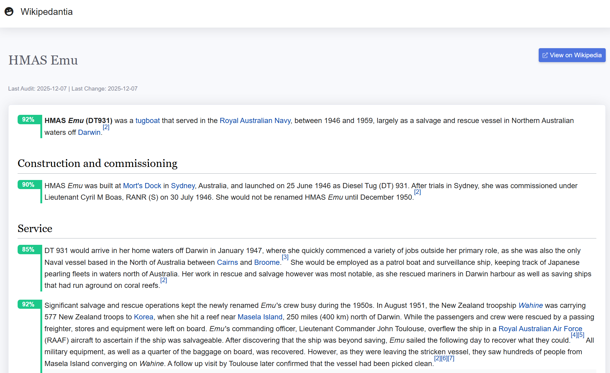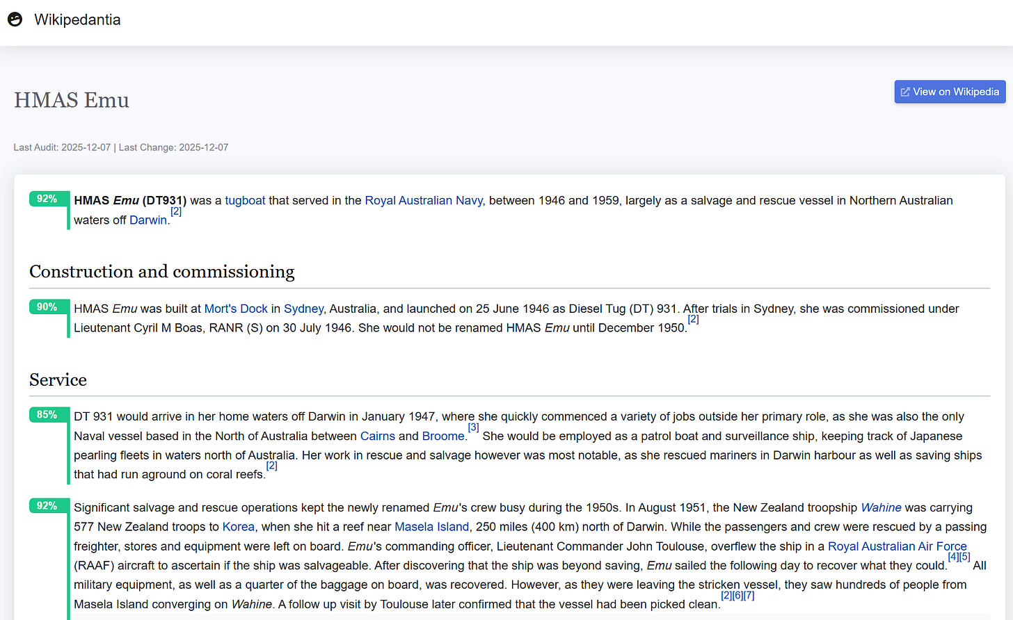 To illustrate, here is an AI analysis of the Wikipedia article on HMAS Emu, an Australian tugboat. I selected this simply because it recently appeared on the “Did You Know?” section of the Wikipedia homepage, with the note that it “once rescued a cigarette-smoking chimpanzee and his magician owner”.: