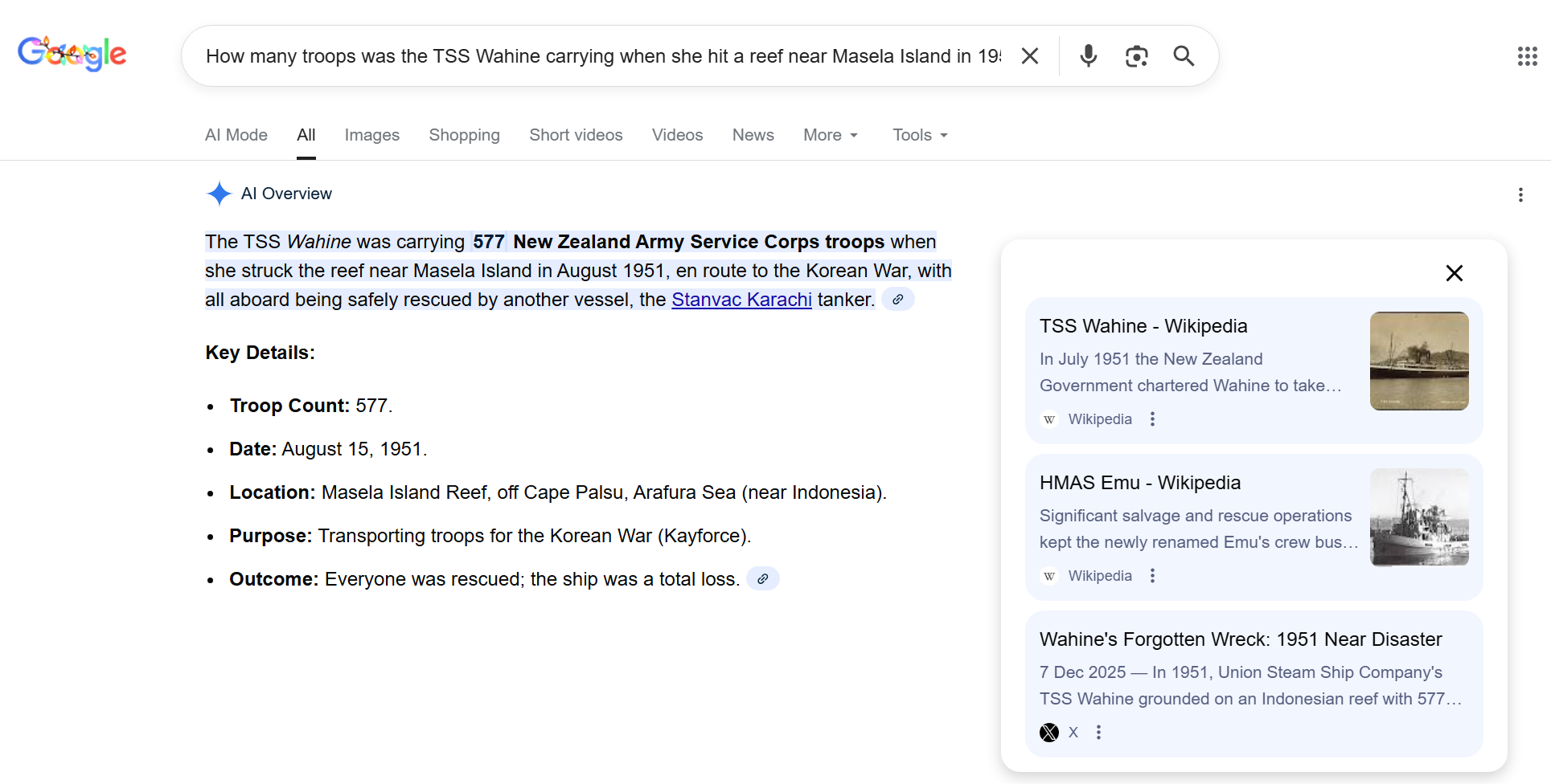 In August 1951, the New Zealand troopship Wahine was carrying 577 New Zealand troops to Korea, when she hit a reef near Masela Island, 250 miles (400 km) north of Darwin.