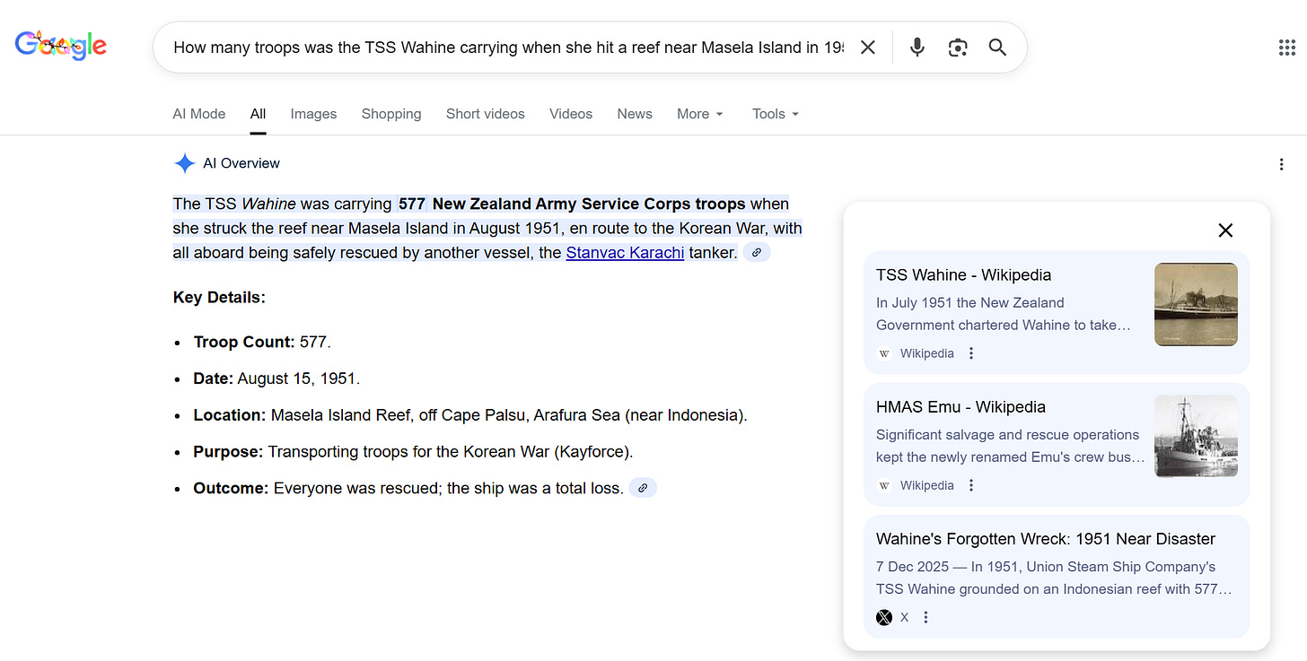 In my opinion, this is exactly the sort of thing AI can be useful for, namely as a human-directed, labour saving tool applying defined rules to rapidly compare text to sources it has been provided with. Given those three sources, and that text, and Wikipedia’s extensive rules on sourcing, the most we can say is that - according to those sources - there were 577 troops on board when it left Wellington, and 575 on board when it ran aground two weeks later. It is absolutely feasible to have an automated tool flagging up potential errors to editors and readers alike, and in my opinion this is the kind of endeavour that could benefit Wikipedia as a whole if integrated both into the editing process and into the reader’s view of a page.