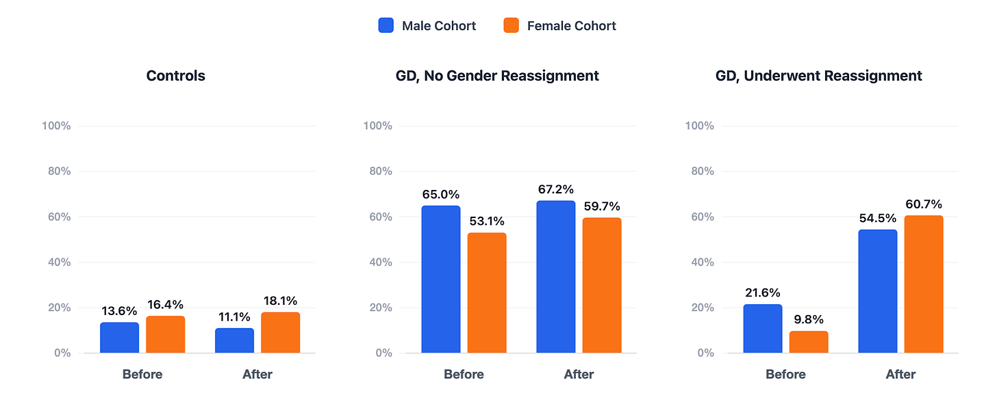 What this study found was that not only was there a higher rate of serious psychiatric issues in those who were referred to gender services - which increased markedly in the cohort referred after 2010 - but that those who underwent medical treatment also got significantly worse: